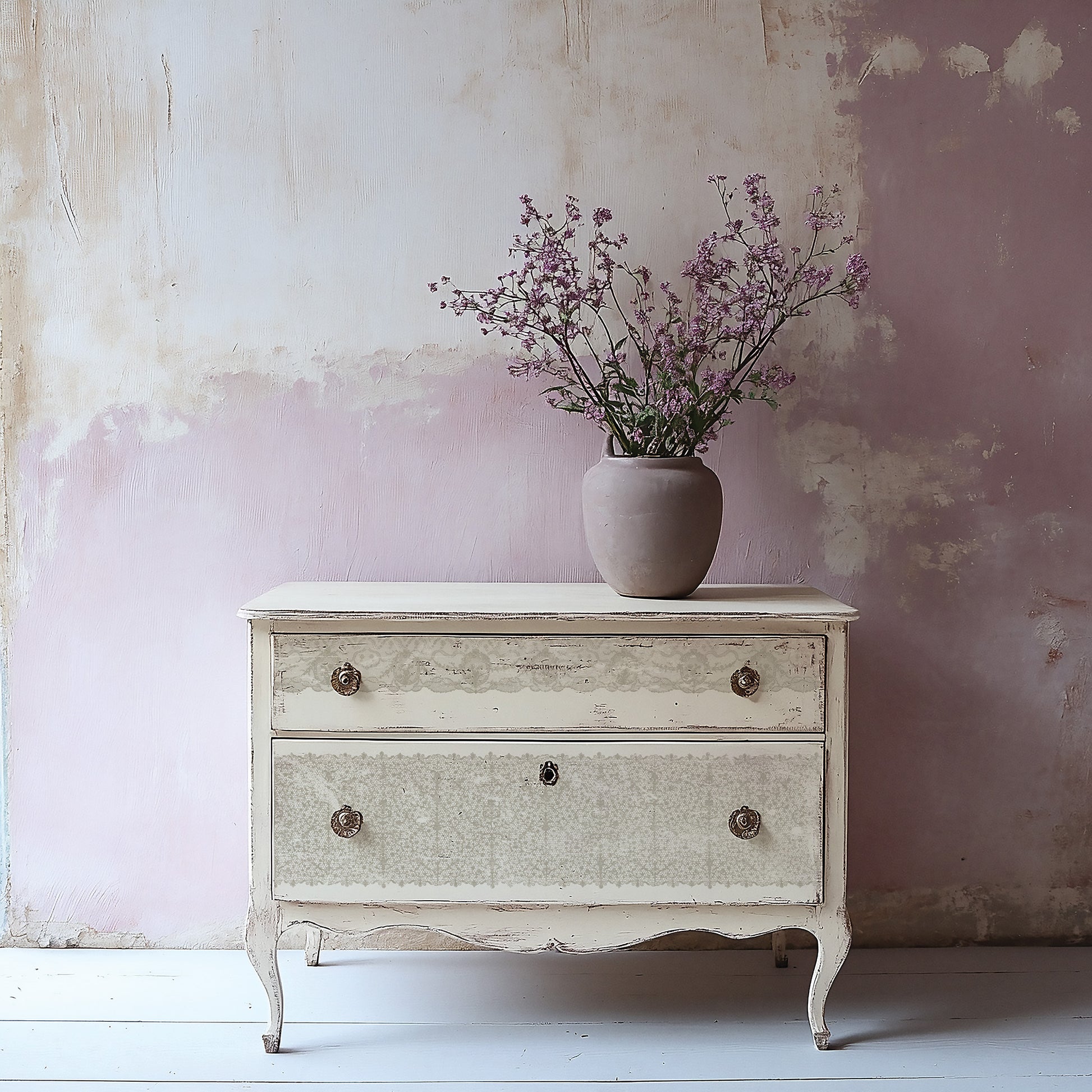 Crafted with intentional edges for seamless tiling, this stamp creates an effortless all-over lace pattern perfect for furniture, walls, and statement decor. With three distinct lace designs and scales included, it offers versatility for both large-scale projects and intricate mixed media work. Use it as a delicate repeating pattern or “tickle” the surface for subtle, crackle-like hints of vintage lace texture.