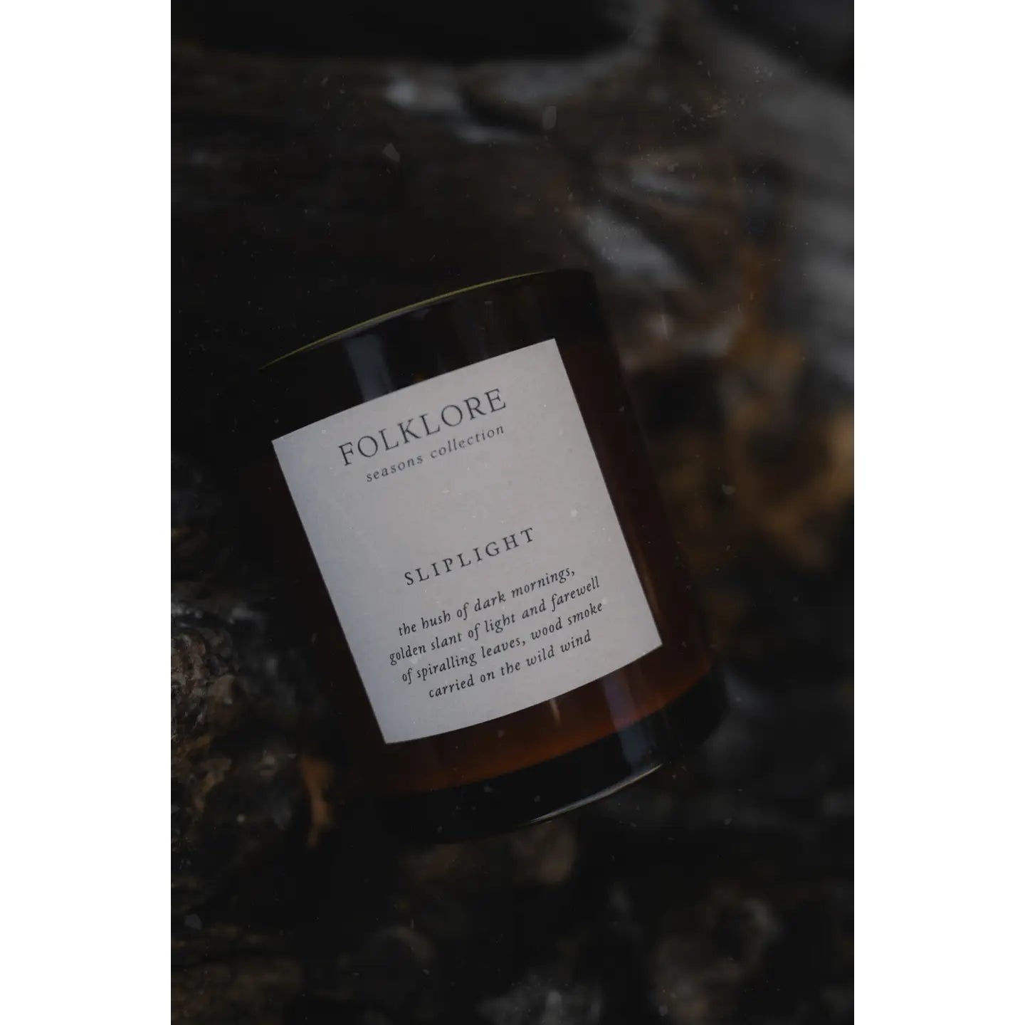SLIPLIGHT the hush of dark mornings, golden slant of light and farewell of spiralling leaves, wood smoke carried on the wild wind with notes of: roasted chestnut, wood smoke, clove, cedar, patchouli