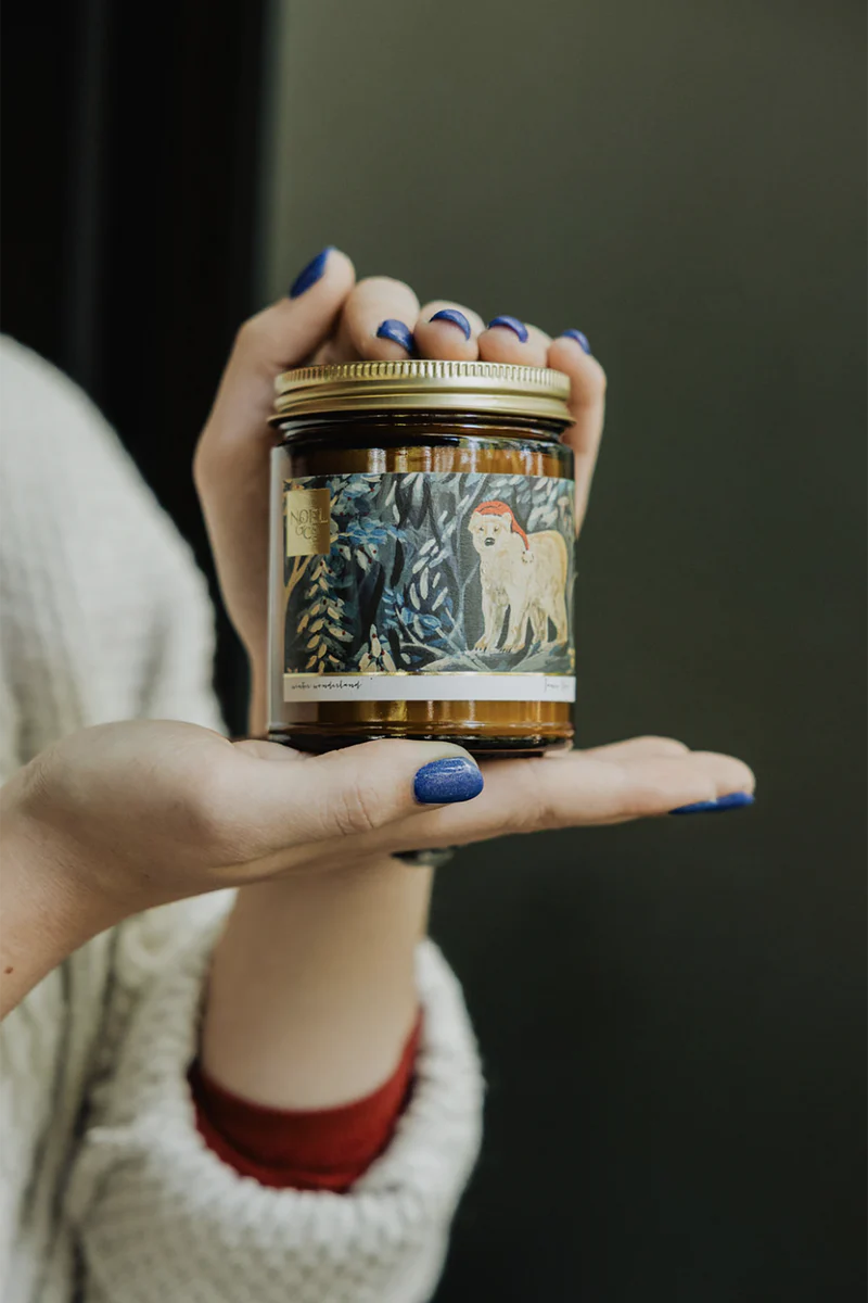 Crisp juniper needles, cypress branches, and cedarwood cooled by winter air. This special candle was hand painted by my sister Janie.